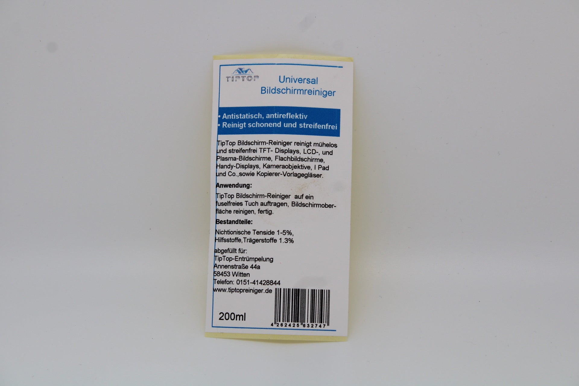 Herzlich willkommen bei uns, dem Ort, an dem Klarheit und Brillanz auf Sie warten! Wir präsentieren mit Stolz unseren TipTop Bildschirm-Reiniger , eine bahnbrechende Lösung für die mühelose und streifenfreie Reinigung von TFT-Displays, LCD- und Plasma-Bildschirmen, Flachbildschirmen, Handy-Displays, Kameraobjektiven, Tablets und vielenm mehr, Kopierer-Vorlagegläsern.